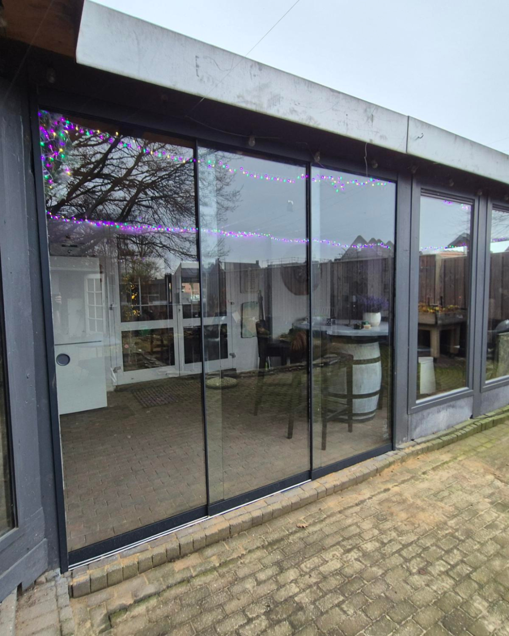 • Glazen schuifdeuren voor terrasoverkapping – Houd regen en wind buiten zonder het open gevoel te verliezen.